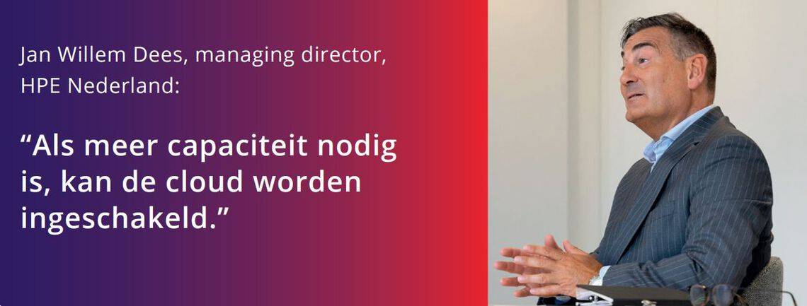 De vraag wat dan anders moet, wordt beantwoord door Dees, managing director van HPE Nederland. “Een mogelijke oplossing is tijdelijk gebruikmaken van de cloud. Het eigen datacenter voorziet in de basiscapaciteit. Als meer nodig is, wordt de cloud ingeschakeld. Als de crisis voorbij is, kan het gebruik van de cloud weer worden afgeschaald.”