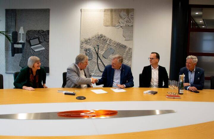 Eddie van Born van Fomax (links) en Eric van Schagen, ceo Simac, (rechts) schudden elkaar de hand.